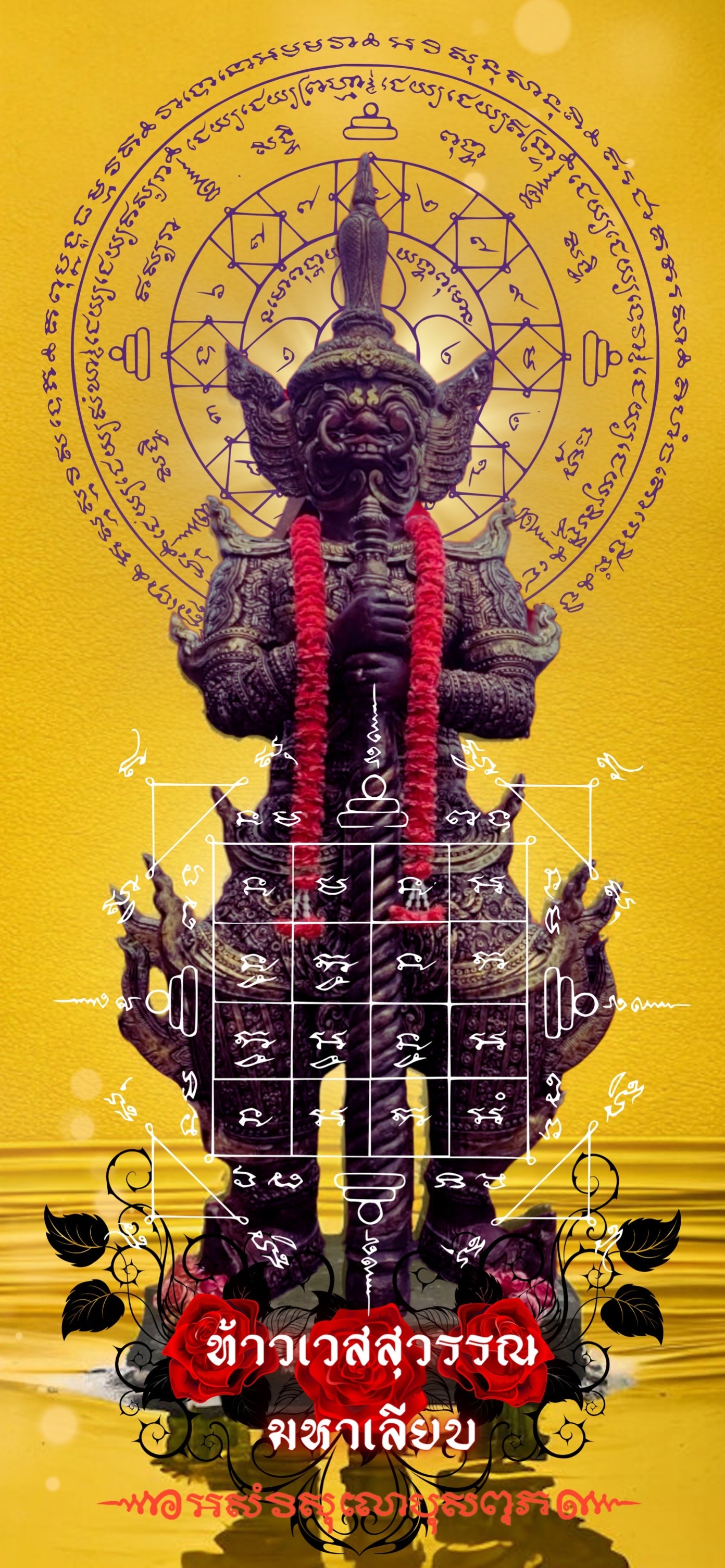 “อิติปิ โส ภะคะวา ยมมะราชาโน ท้าวเวสสุวรรณโณ มะระณัง สุขัง อะหัง สุคะโต นะโม พุทธายะ ท้าวเวสสุวรรณโณ จาตุมะหาราชิกา ยักขะพันตาภัทภูริโต เวสสะ พุสะ พุทธัง อะระหัง พุทโธ ท้าวเวสสุวรรณโณ นะโม พุทธายะ”