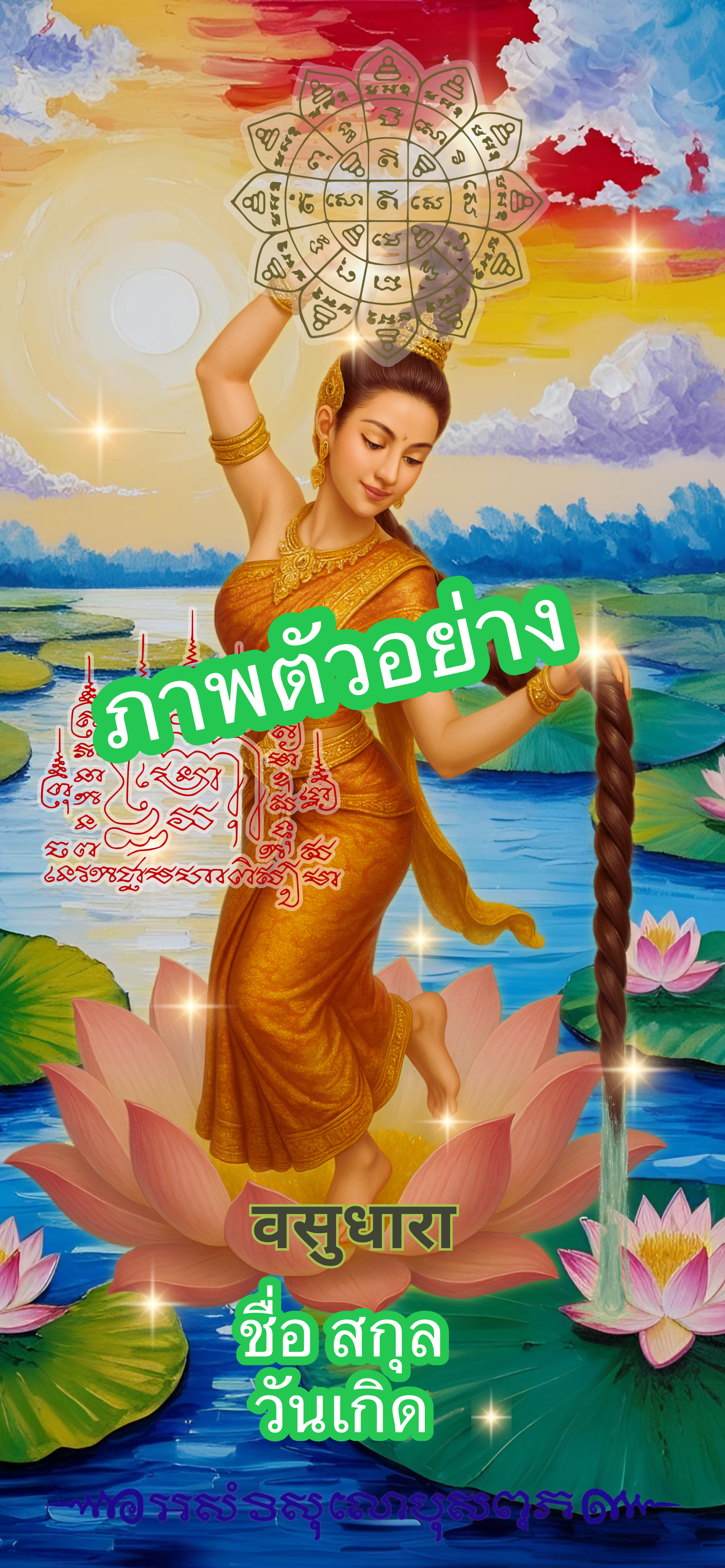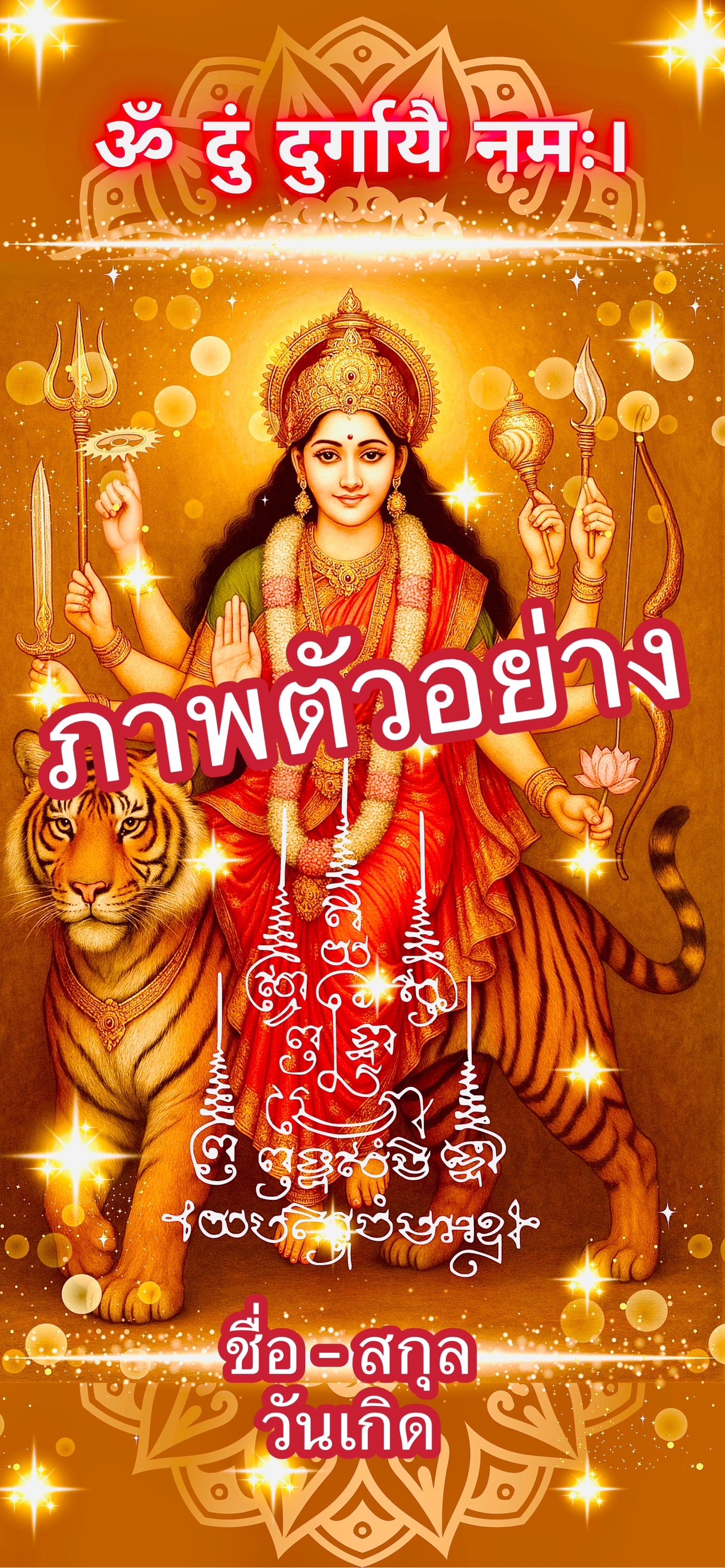 If you wish to order a personalized mobile wallpaper with your name and birthdate, the cost is 199 Baht. The available images are of Phra Mae Thorani (Mother Earth) standing and Uma Devi riding a tiger, each blessed individually for you.