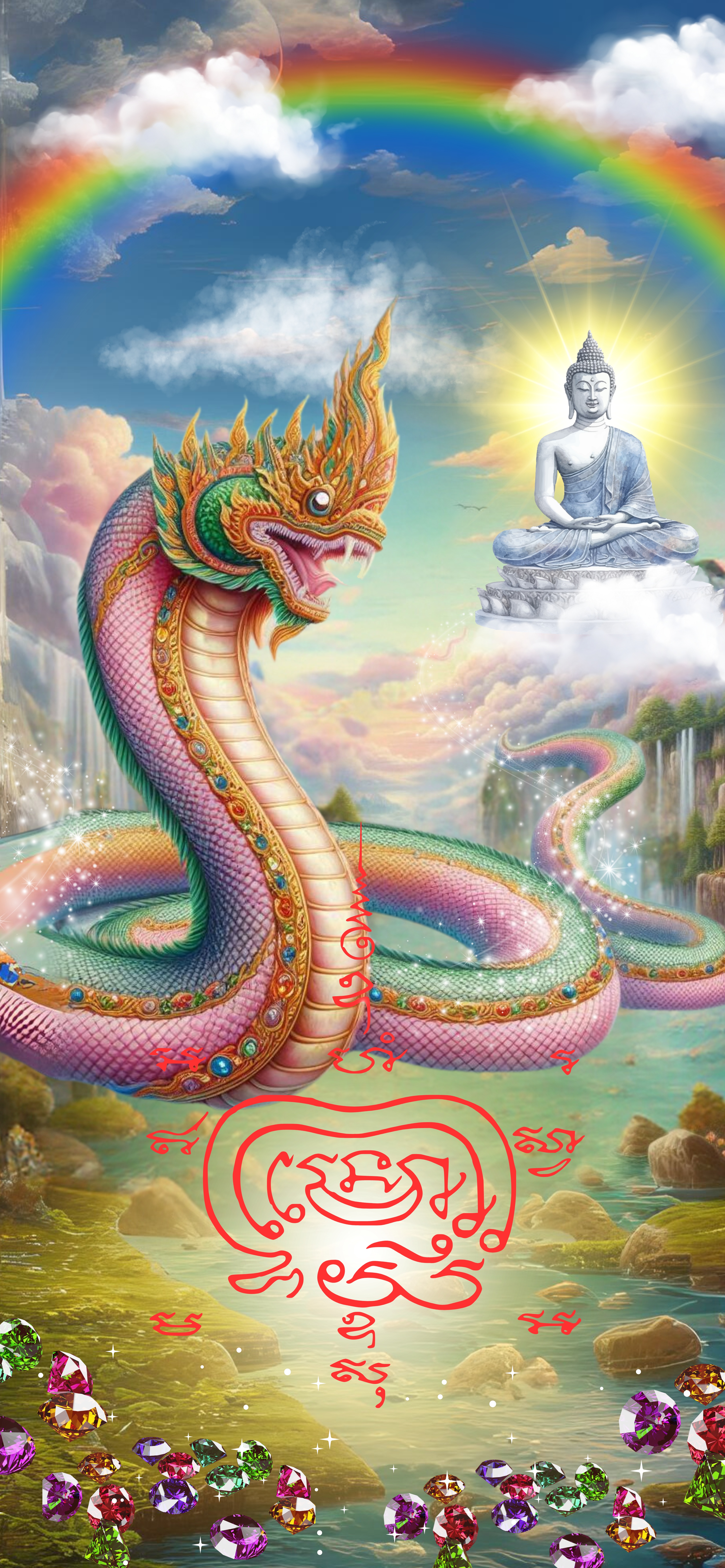 Nesta imagem, prestar homenagens ao Buda ajuda a mente a transcender o sofrimento, enquanto a Naga é invocada para boa fortuna.